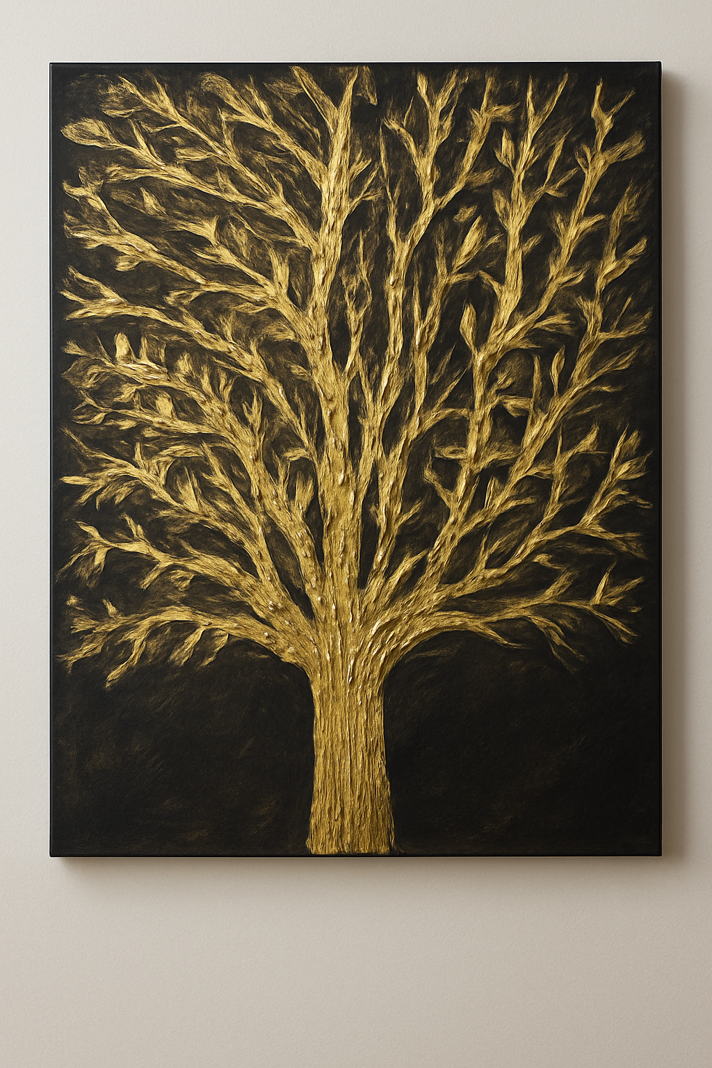 El işçiliğiyle üretilmiş bu 50x70 cm dokulu tablo, altın efektli kabartma ağaç tasarımıyla modern ve şık bir görünüm sunar. Derin dokusu, ışığa göre değişen altın yansımaları ve koyu fonu sayesinde bulunduğu ortama güçlü bir karakter katar. Salon, oturma odası, ofis ve butik dekorasyon alanlarında dikkat çeken bir atmosfer oluşturmak için ideal bir parçadır. Tamamen el yapımı olduğundan her bir ürün özgün ve tektir.
