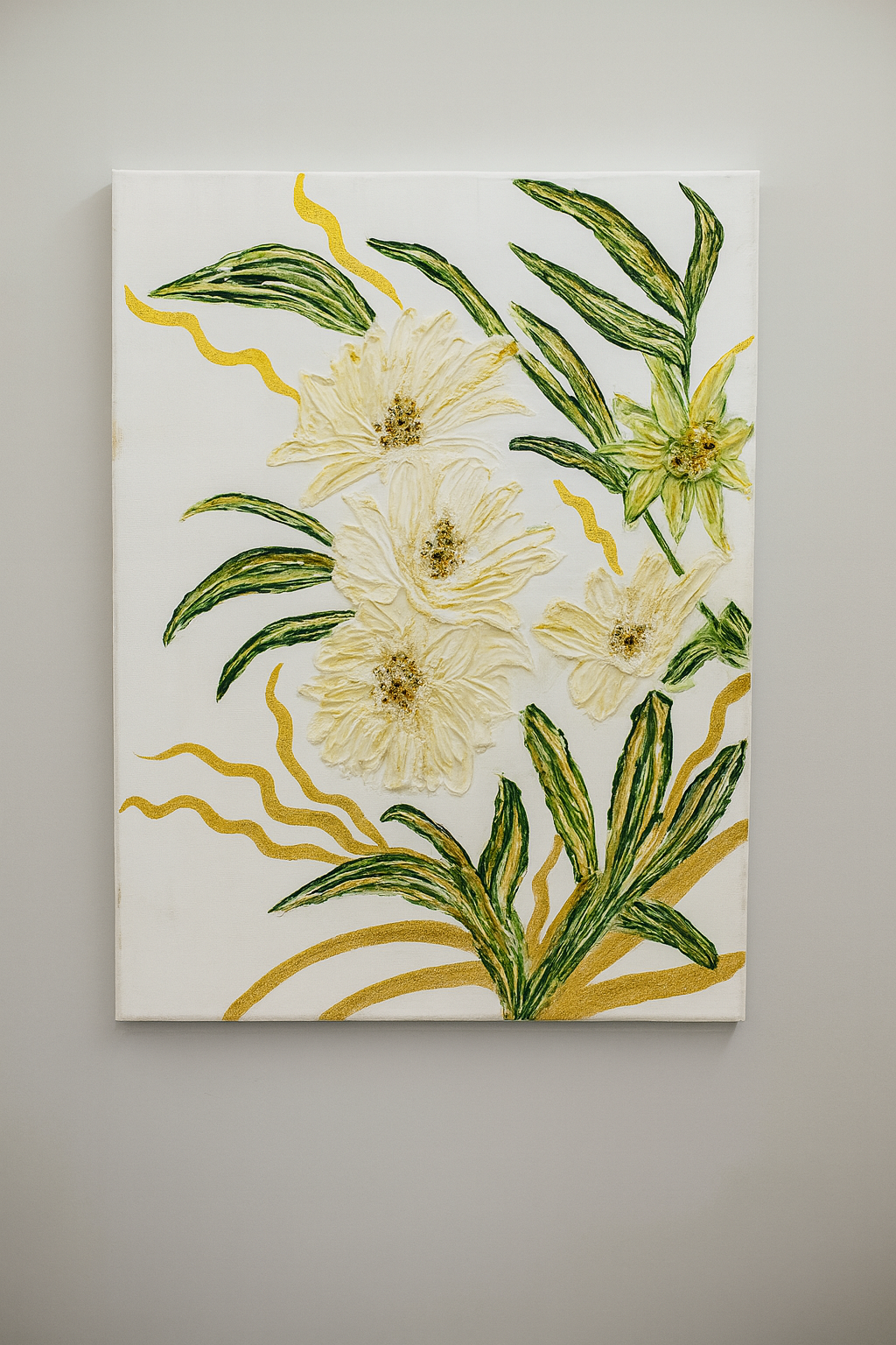 Bu özel tasarım 50x70 cm el yapımı duvar tablosu, kabartmalı çiçek motifleri ve altın detaylarıyla dekorasyonunuza zarif bir dokunuş katıyor. Dokulu yüzeyi ve pastel tonlardaki çiçek işlemeleri, tabloya hem modern hem de sanatsal bir görünüm kazandırıyor.