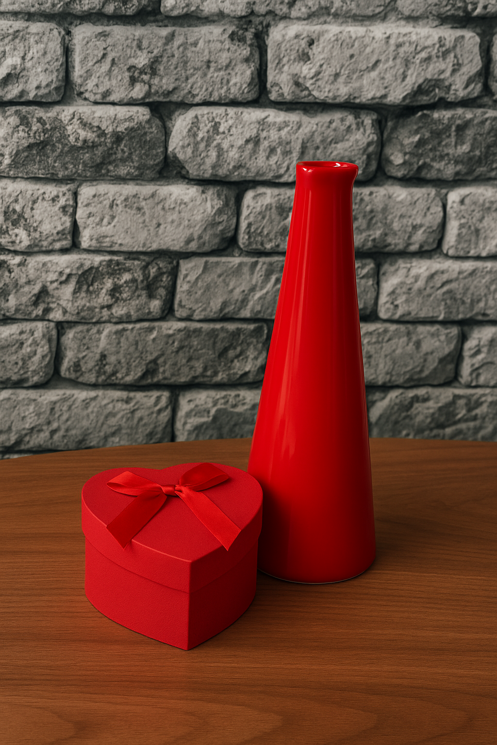 Kırmızı Mini Dekor Vazo & Kalpli Hediye Kutusu Seti